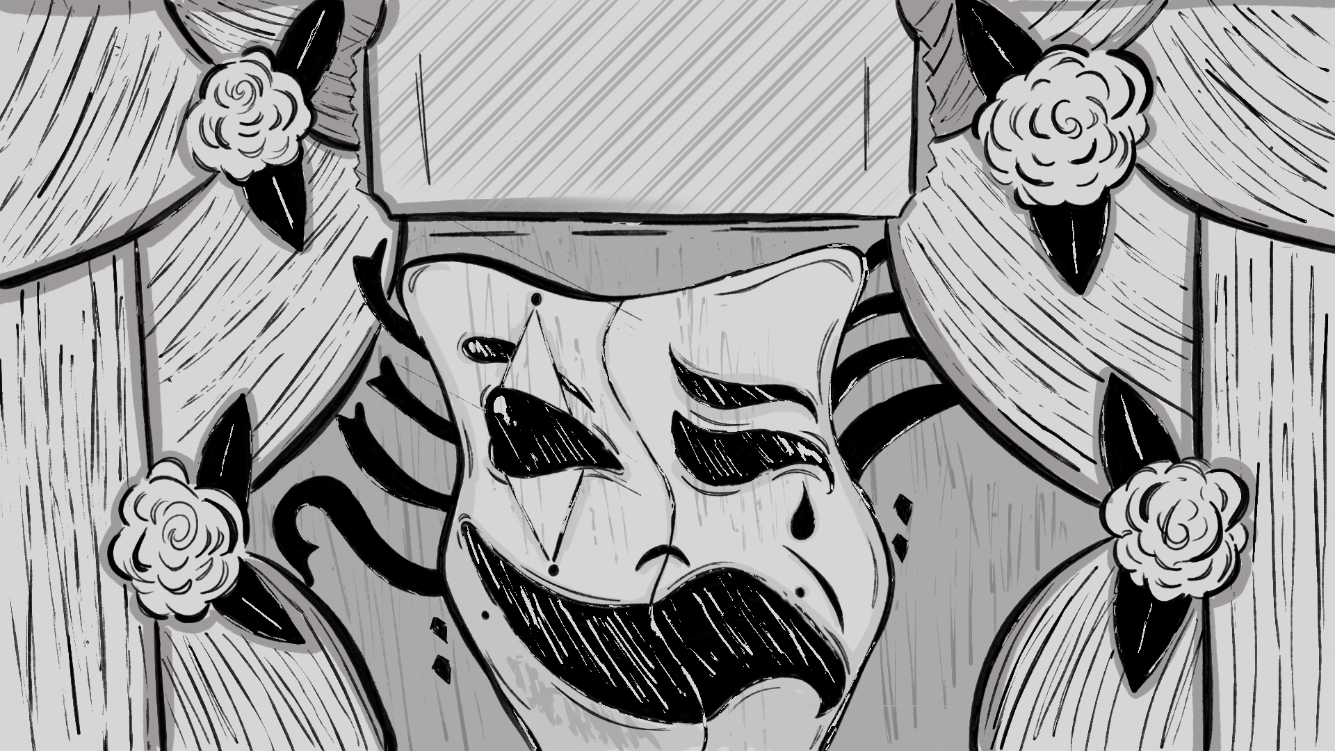 Swap between tragedy & comedy masks to change the enviornment of a theatre stage and help the character(s) solve their problem.